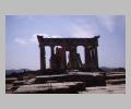 Doric peripteral temple, 6 x 12 columns. A 3 stepped sloping ramp provided access at the east end. The temple had a pronaos and an opisthodomos, both distyle in antis and a cella with 2-story colonnade and gallery. A ladder led to the upper gallery, which was perhaps used to store votives. All but 3 column shafts were monolithic; the three drum-built columns were perhaps left open during construction to allow access to the interior of the temple.